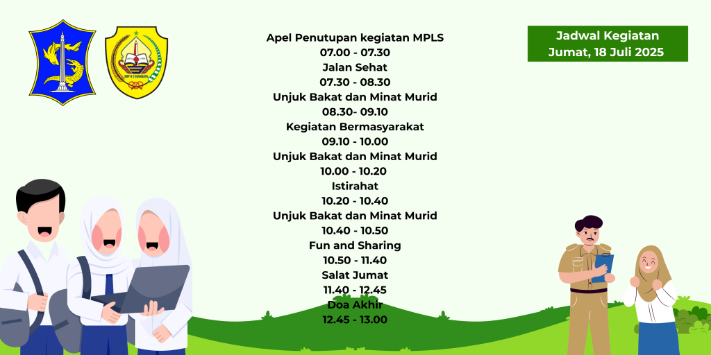 Halo siswa-siswi baru SMPN 3 Surabaya, setelah adik-adik menyelesaikan kegiatan hari ke-empat MPLS SMPN 3 Surabaya yang telah diselenggarakan pada hari Kamis, 17 Juli 2025. Selanjutnya adik-adik akan mengikuti kegiatan MPLS hari ke-5, Hari Terakhir di rangkaian kegiatan MPLS SMPN 3 Surabaya!! yang akan diselenggarakan pada hari Jum’at, 18 Juli 2025. Serangkaian kegiatan MPLS akan dimulai pada hari Senin, 14 Juli 2025 hingga Jum’at tanggal 18 Juli 2025. Pihak Sekolah akan memberikan kepada adik-adik murid baru SMPN 3 Surabaya informasi mengenai rundown kegiatan yang akan adik-adik lakukan setiap hari nya dalam mengikuti kegiatan MPLS, sehingga adik-adik murid baru SMPN 3 Surabaya bisa mempersiapkan diri sebaik-baiknya dalam mengikuti serangkaian kegiatan “MPLS SMPN 3 Surabaya Tahun Ajaran 2025/2026”. Ada yang spesial loh di hari ke-lima ini, Jadi pantau terus website smpn3sby.sch.id ya dan jangan sampai ketinggalan berita dan pengumuman terbaru nya